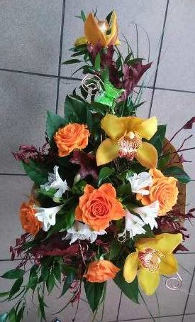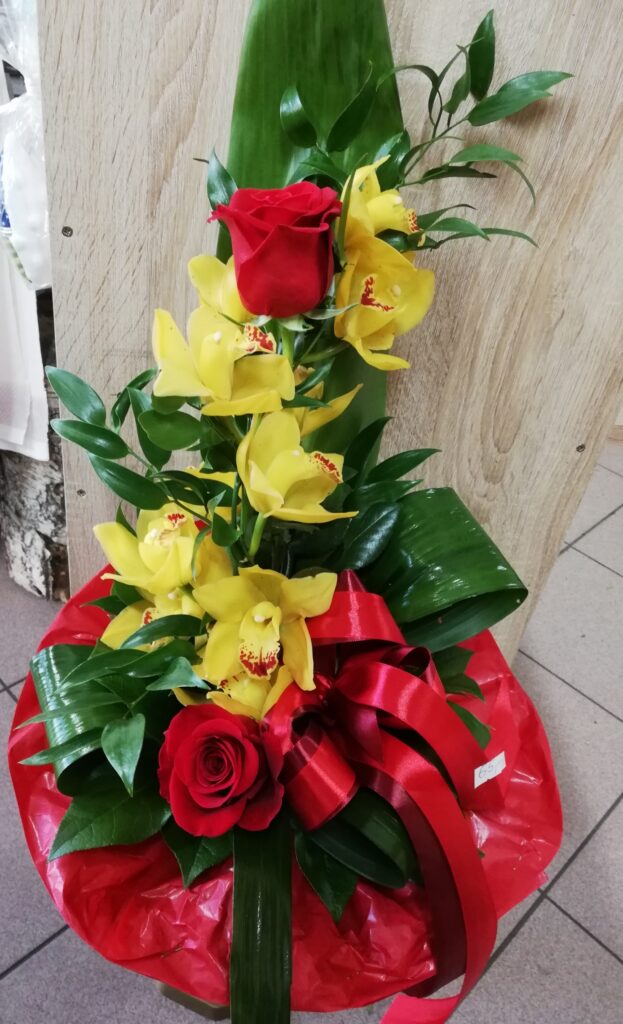 Bukiet Okolicznościowy nr 18, Bukiet wy stopniowany ( Żółty storczyk cymbidium+ Róża herbaciana+ alstromeria biała)