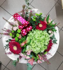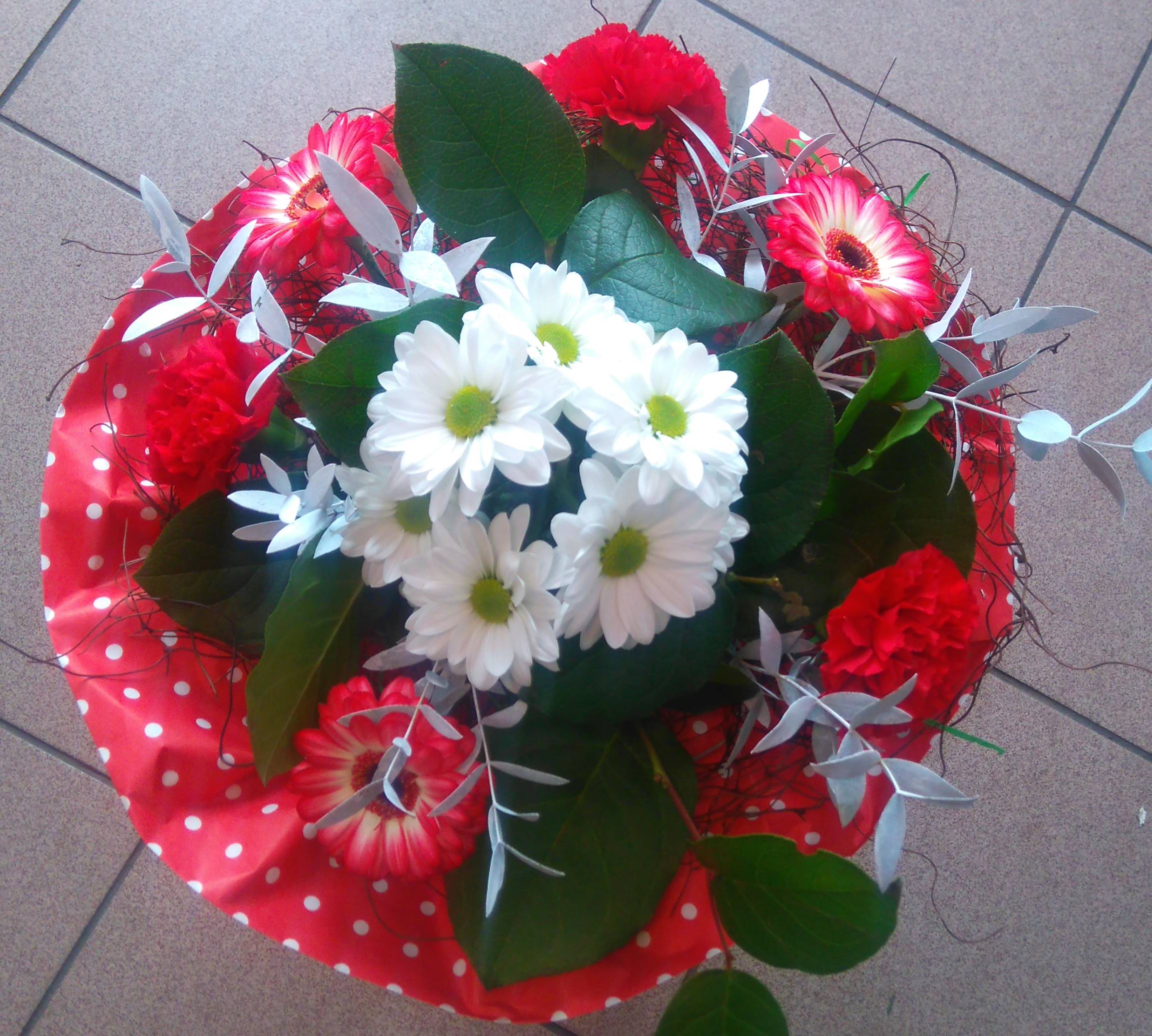 Bukiet Okolicznościowy nr 10 (margaretka biała +goździki czerwone+ gerbera mini czerwono-biała)