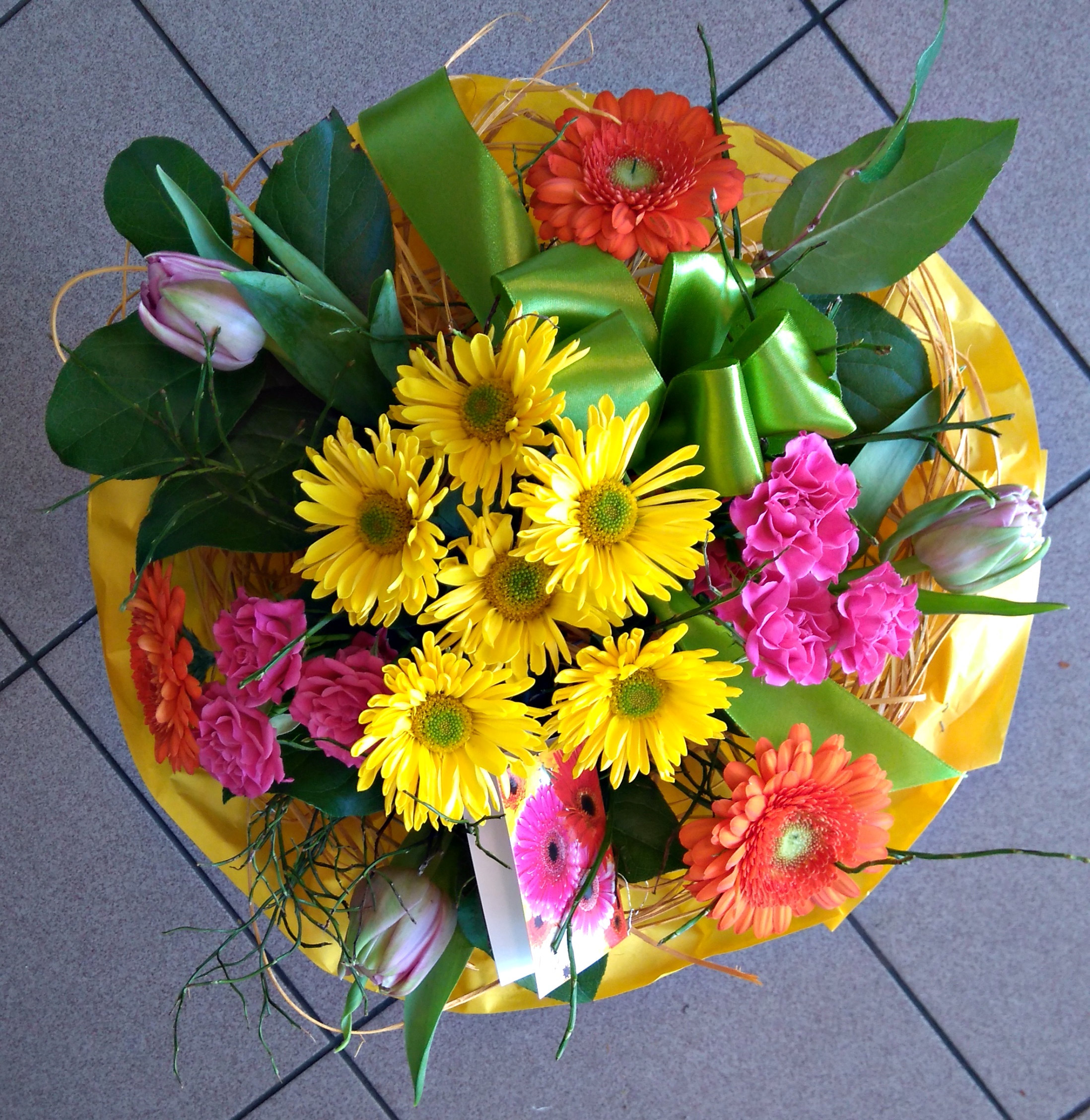 Bukiet Okolicznościowy nr 13 (Margarteka różowa+gerbera pomarańcz+frezja żółta+eustoma+ przybranie)