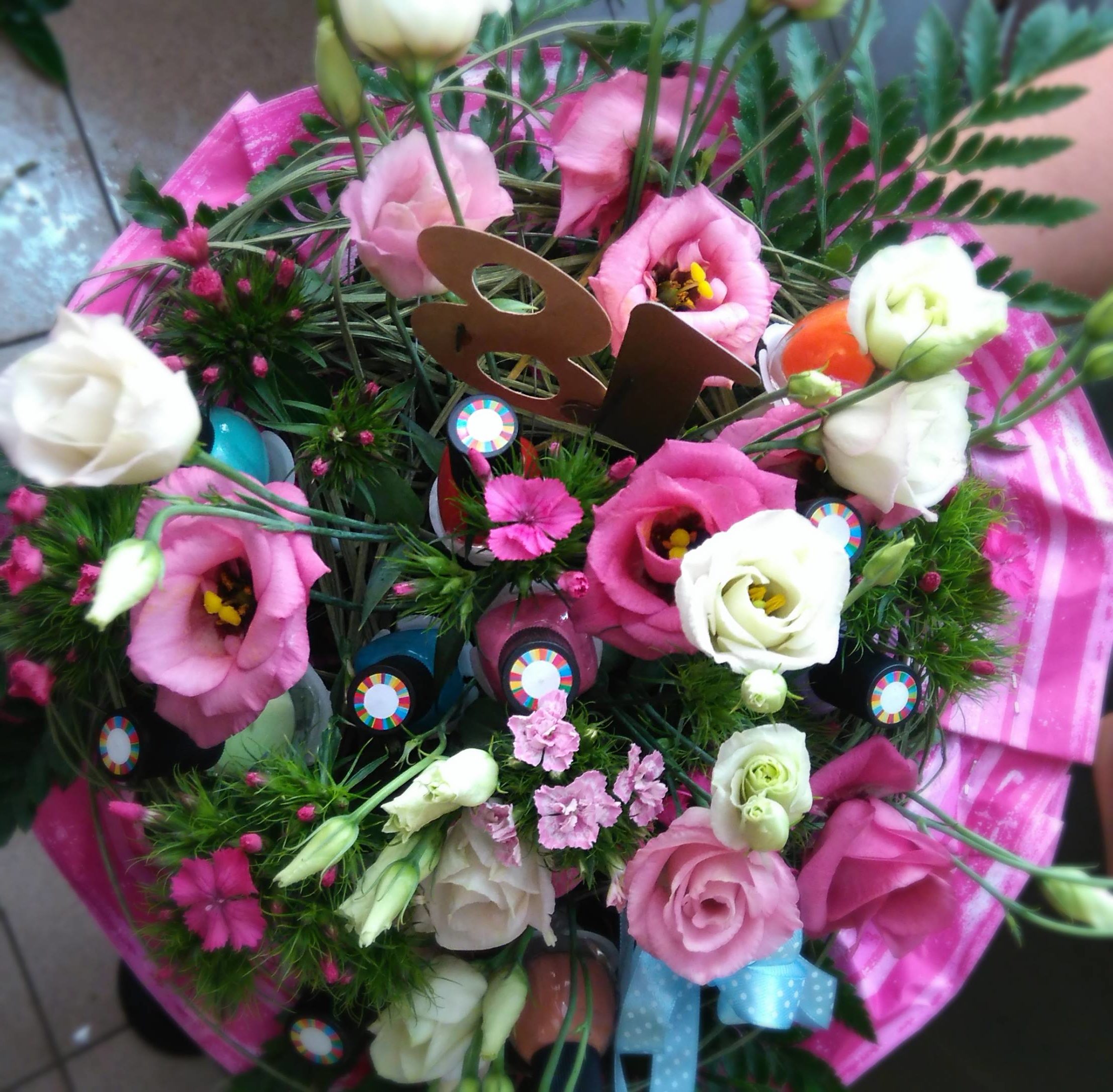 Bukiet Okolicznościowy nr 7Bukiet z lakierami do paznokci+ eustoma+ przybranie